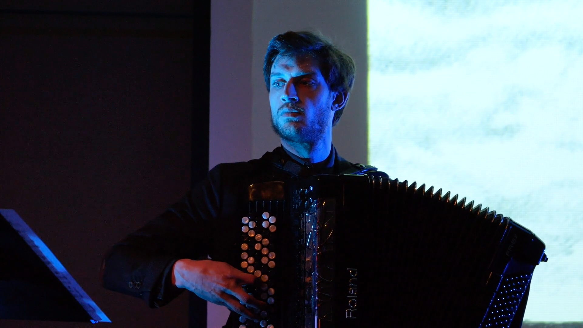 An other version of the music was created for live performance with one single electronic accordion. To make it possible, I mapped the correct strings, harp and brass notes (as audio files) to the buttons of the Roland electronic accordion and triggered each of the 5 sets with a foot controller while playing the accordion part. This system allows me to change and fluctuate the tempo for each performance.